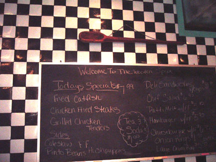 Last night, my wife Lynda and I had the pleasure of dining at the Wooden Spoon restaurant owned and operated by Duane and Karol Allen of Calvert, Texas. The Allen's and their friends have done a spectacular job of transforming a 140 year old building into one of the most spectacular eating establishments I have ever visited. Our waitress, Gracia De Santiago was charming and a steady stream of Calvert citizens came through the front door. I had the chicken fried steak special and Lynda had the fried catfish...I know many restaurants in Texas claim to have the best chicken fried steak in Texas but that's because they've never tasted the steak cooked by Karol Allen at the Wooden Spoon!! Karol, who has worked for months roofing and getting the 140 year old historic building at 726 Main Street ready for opening day, describes the decor of the 1868 Grocery Store as "Antique Abstract". She has done an amazing job...everything is magnificant from the transformed ceilings, walls and floors to the beautifully done kitchen, and bathrooms. Her friend Gracia, who also doubles as a waitress at the Spoon, painted the tabletops, outdoor signs and the counter area. You have to see the pictures The Wooden Spoon in Historic Calvert, Texas or better yet, drive down for a visit. They're located at 726 Main street in Calvert...Just look for the large "Eat" sign out front or give them a call at (979) 364-2380. They're open 7 days a week 11:00AM to 9:00 PM.