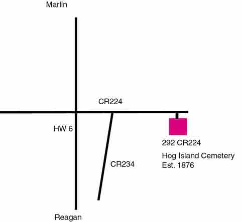 The easiest way to find the Hog Island cemetery is to go north on HW6 from Reagan driving towards Marlin. About 2 miles north of Reagan, you'll see the big green Washington Cemetery sign pointing west of HW6. Turn right on County Road 224 and head east until you see a big house on the left side of the road and a mailbox on the right side of the road with the Address: 291 CR224. The gate to the entrance of Hog Island Cemetery is on the right side of the road. Enter the gate and drive back to the cemetery.