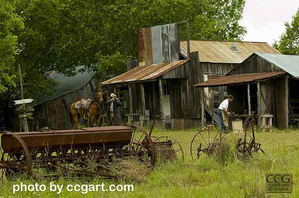 A row of old mule-drawn iron agriculture tools can be found out past the working blacksmith shop. The primitive log barn