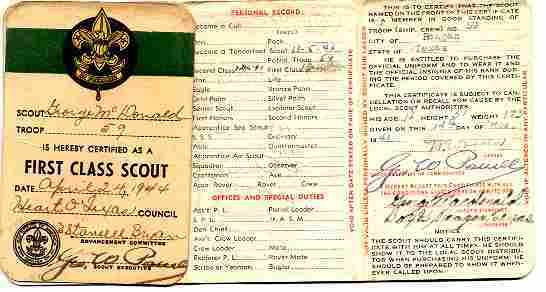 In April of 1944, Scout Troup 59 of Reagan was alive and well. George Macdonald's First Class Scout certificate.