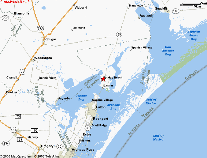 The map above shows the Texas coast line near Rockport. The Holiday Beach subdivision faces Copano Bay approximately 5 miles northeast of Rockport off Highway 35. The lots are near Aransas Pass and Padre Island and the intercoastal water canal with wonderful fishing, boating and bird watching.
