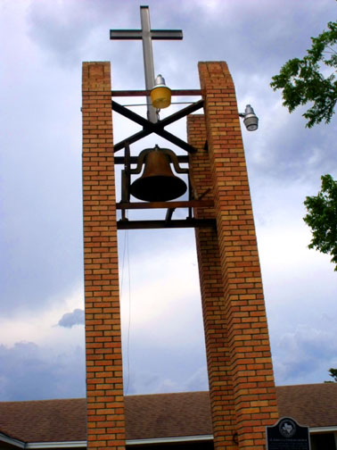 Historic 800 pound bell from the original church (1917)donated by the John B, Luedke Sr. family. According to Gloria (Skopek) Pimpler, Great Granddaughter of John Luedke, " I recall the bell being rung many times for funerals and services and once while I was riding atop a load of hay, the bell was rung with joy marking the end of WWII."