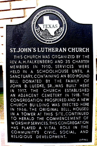 Just visited your wonderful website, really enjoyed the stories of Deanville and Hranice and Dime Box as that is where my ancestors settled. J. B. Luedke Sr, , who helped found the St. John Lutheran Church in Deanville was my Great Grandfather. Our family lore has it that he dedicated the bell for the new church. I have heard it rung many times for funerals and services, and even while riding atop a load of hay when it was rung with joy marking the end of WWII. His son, Otto R. Luedke, my Grandfather, was a charter member, Sunday School Supt for 25 years, played the organ for services, and even swept out the church on Sunday mornings and stoked up the old wood stove when it was cold.