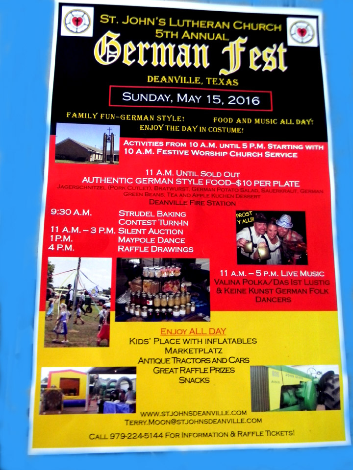 Activities from 10:00 A.M. til 5 P.M. Delicious German-Style Food -take out plates or eat at the Deanville Fire Station, just $10 a plate until sold out. Features kids inflatables, marketplatz goods, antique tractors and cars, great raffle prizes, polka music, silent aution, Maypole dance, live music, German folk dancers, and much more. Check out the photos from an earlier German Fest celebration!!
